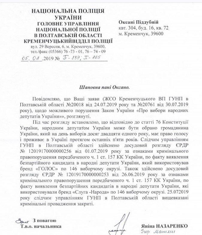 24-го июля она получила ответ из следственного управления Главного управления Нацполиции в Полтавской области. Пиддубной сообщали, что её заявление зарегистрировано, и изложенная ею информация о кандидате-двойнике проверяется в рамках досудебного расследования по делу №12019170000000253.