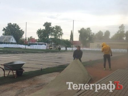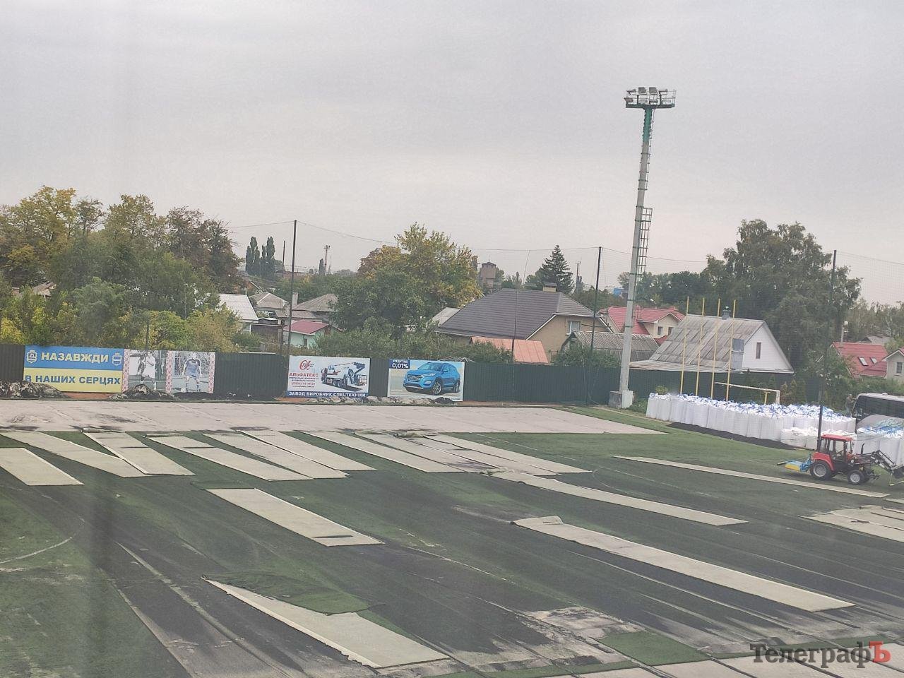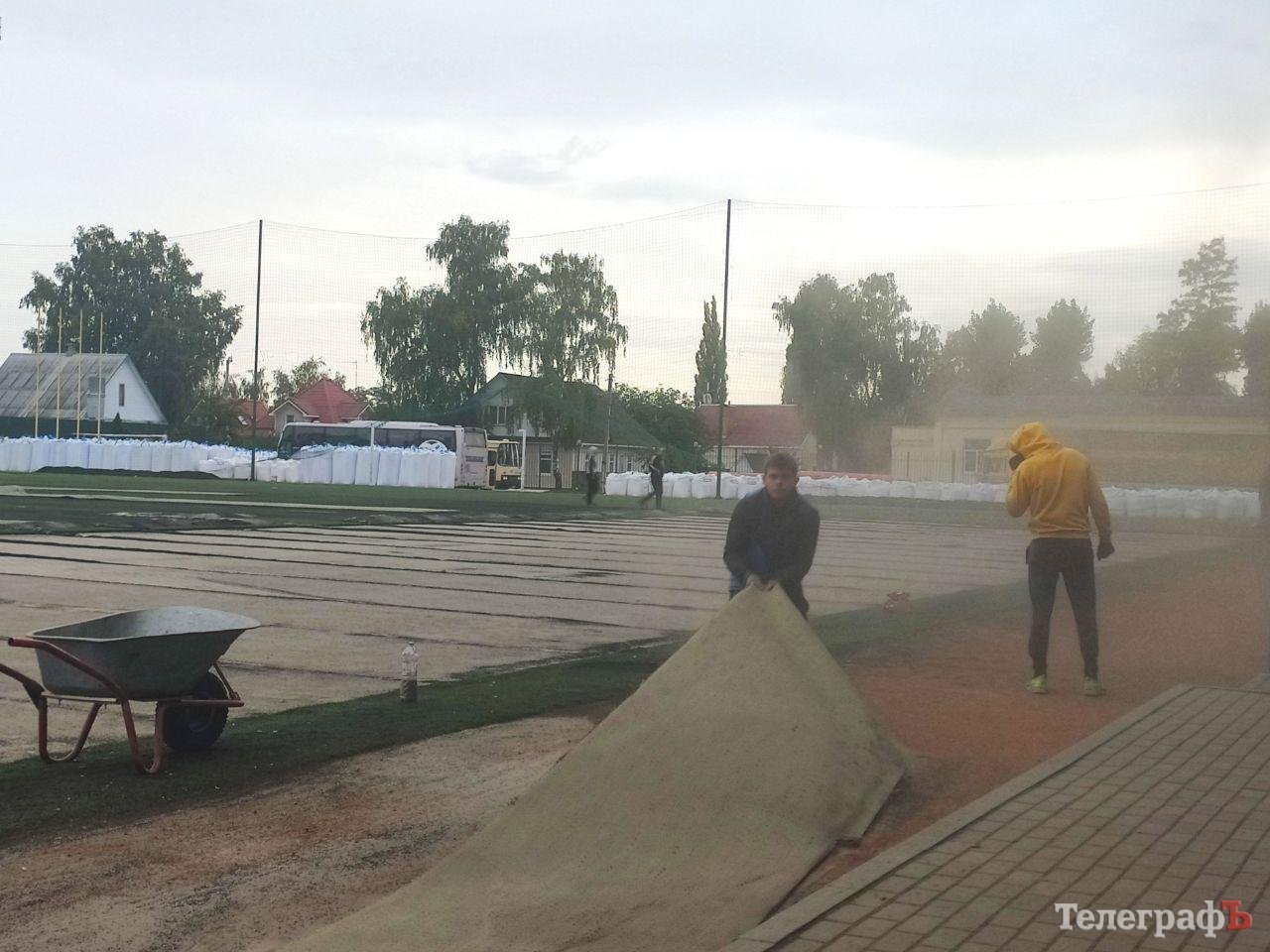 Штучне покриття на стадіоні «Кремінь-Арена» поступово знімають. Робітникам фірми та працівникам «Кременя», які також долучилися до роботи, доводиться знімати поступово газон, витрушувати, а тони піску та гумової крошки вивозити за межі поля. Через періодичне на крапання дощу роботи ускладнюються, адже вологий пісок прилипає до газону й потребує більших зусиль для його витрушування.