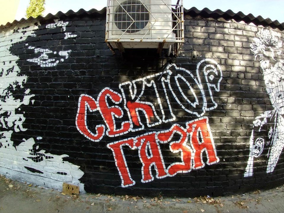 Для тих, хто бажає помилуватися графіті «Сектор Газа» даємо підказку: зупинка «Афіни» в напрямку будинку №13 по вулиці Велика набережна до магазину «Porter» де на фасаді й розміщене графіті.