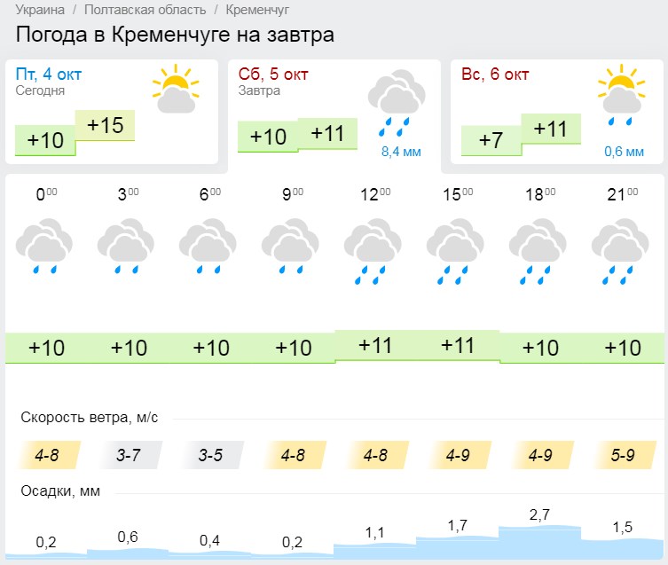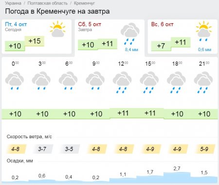 За прогнозом Sinoptik, у Кременчуці протягом усього дня погода буде похмурою, йтиме дощ і до вечора він досягне найбільшої сили. Температура повітря триматиметься на рівні +8...+10°С.