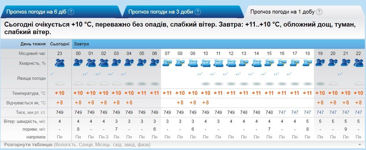 Gismeteo також прогнозує дощ на цілий день, який накрапатиме в першій половині дня і посилиться післяобід. Температуру повітря обіцяють на рівні +10…+11°С.