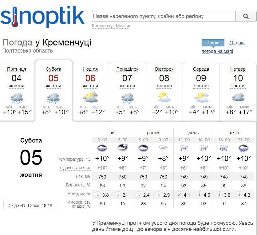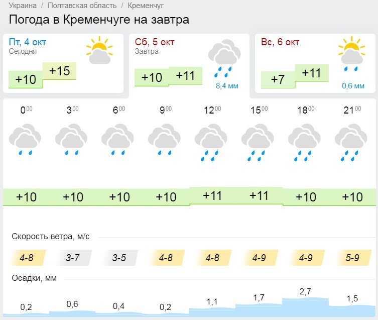 За прогнозом Sinoptik, у Кременчуці протягом усього дня погода буде похмурою, йтиме дощ і до вечора він досягне найбільшої сили. Температура повітря триматиметься на рівні +8…+10°С.