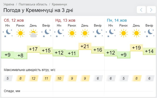 Ventusky обіцяє поетапне збільшення максимальної температури протягом вихідних: +18°С у суботу, +20°С у неділю та +22°С у понеділок. Найпрохолодніше ж буде зранку у суботу, 12 жовтня, — всього лише +7°С. Неділя, 13 жовтня, буде виключно сонячною, а от субота та понеділок характеризуватимуться мінливою хмарністю.