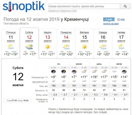 Що стосується Sinoptik, цей погодний портал прогнозує, що у суботу, 12 жовтня, на цілий день небо «окупують» хмари, а у неділю, 13 жовтня, буде ясно. У понеділок, 14 жовтня, ясні години чергуватимуться з похмурими. Температура у вікенд коливатиметься у межах від +7°С до +21°С, найхолоднішим стане ранок суботи.