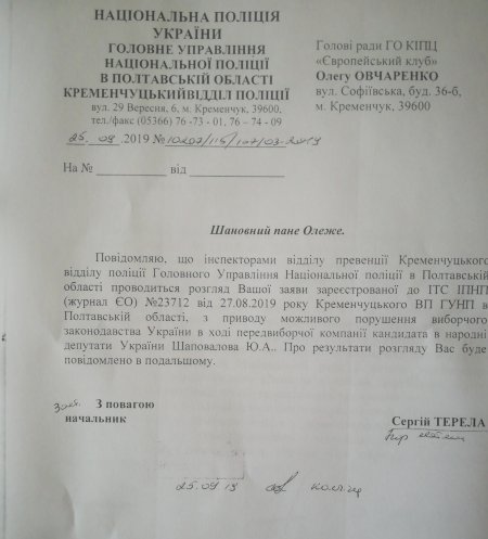 До речі, відповідь із таким змістом підписав не начальник Кременчуцької поліції Сергій Терела, а його заступник Ігор Матяш.