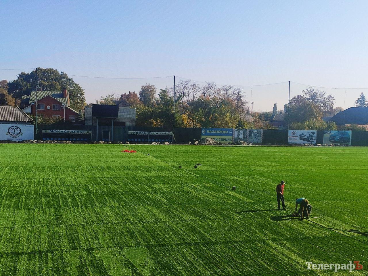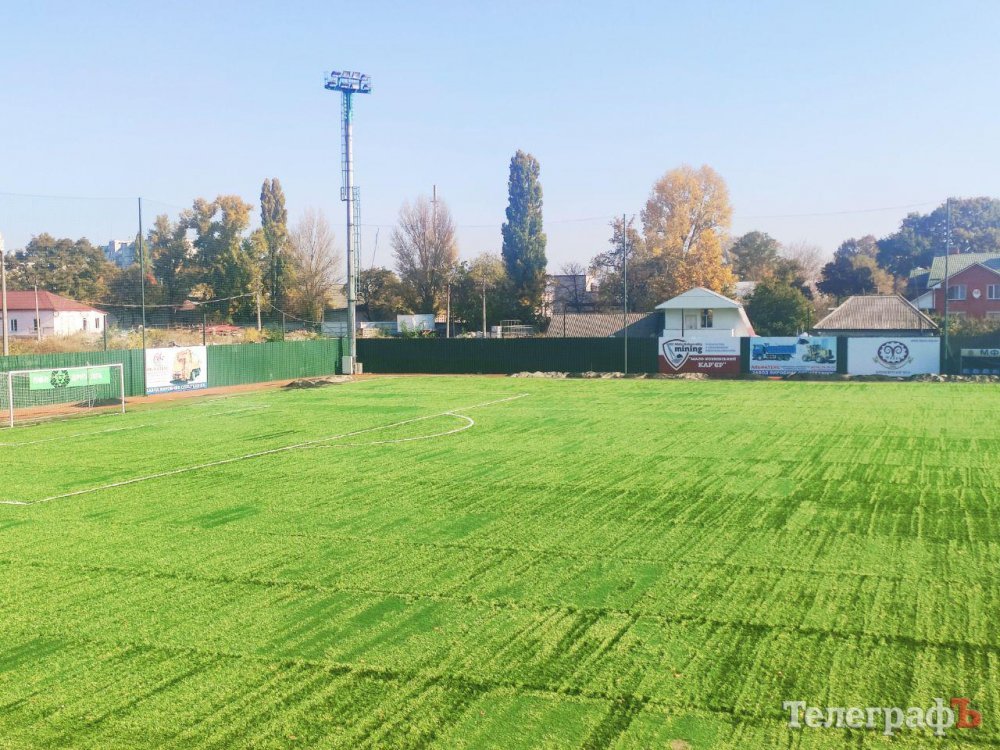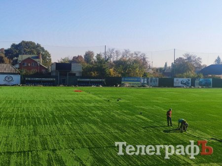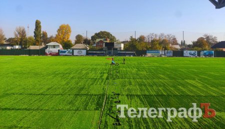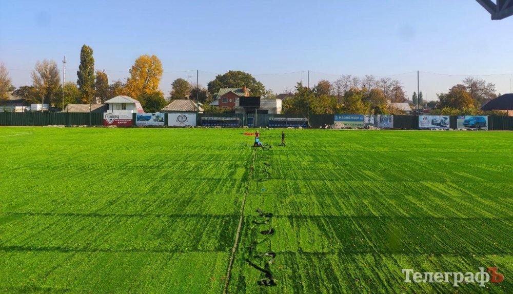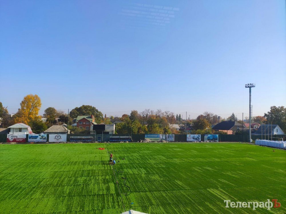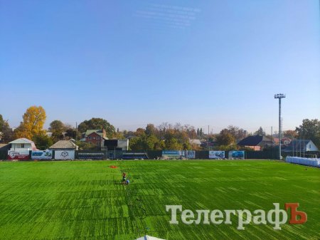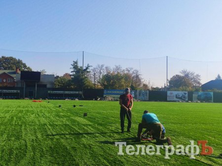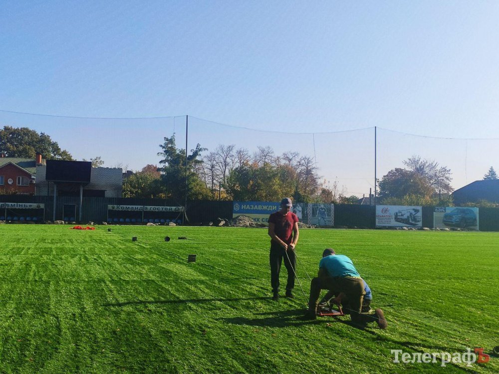 Заміна штучного покриття на стадіоні «Кремінь-Арена» на завершальній стадії. Зараз на стадіоні наносять розмітку поля. До понеділка мають вирівняти покриття та засипати його 20 тонами піску та гумової крихти.