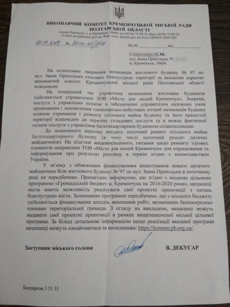На відповідне звернення влада відповіла, що «у зв'язку з обмеженим фінансуванням влаштування нового дитячого майданчика біля житлового будинку №97 на вулиці Приходька в поточному році не передбачено». Також у листі за підписом заступника міського голови Валерія Декусара йдеться, що питання щодо ремонту ігрових елементів передано компанії-управителю ТОВ «Місто для людей».