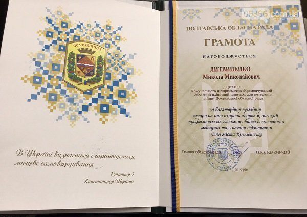 24 жовтня під час сесії Полтавської обласної ради Почесною грамотою нагородили кременчуцького лікаря вищої категорії Миколу Литвиненка.