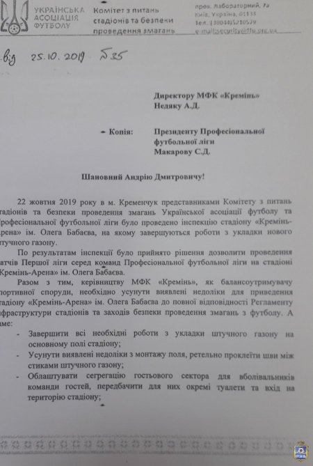 Комісія Української асоціації футболу, яка 22 жовтня, завітала до Кременчука надала дозвіл на проведення футбольних ігор на стадіоні «Кремінь-Арена». Голова комітету з питань стадіонів та безпеки проведення змагань Геннадій Прокопович надіслав до ПФЛ відповідний лист.