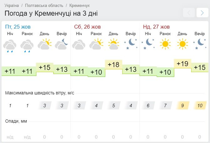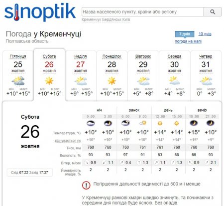 А от Gismeteo на відміну від Sinoptik обіцяє куди більш теплу погоду у вікенд та наступні температурні показники: мінімальна температура складе +9°С, а максимум підніметься аж до +19°С. Субота, 26 жовтня, відзначиться мінливою хмарністю, а неділя, 27 жовтня, стане виключно ясним днем.