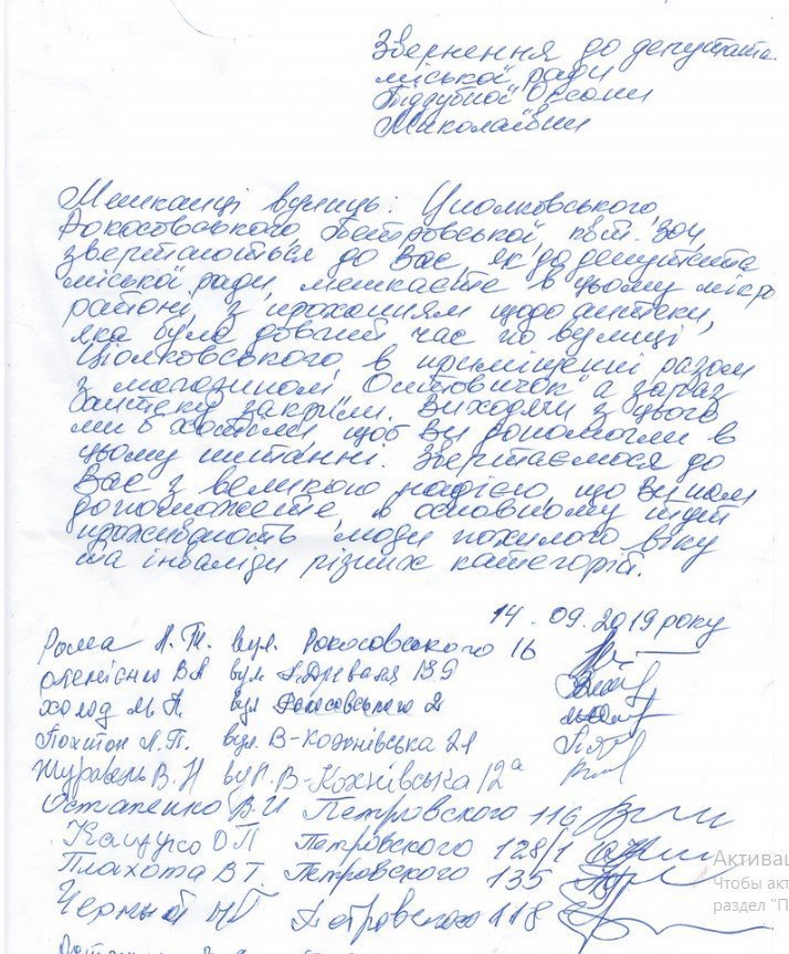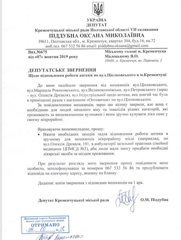 Пиддубная регистрирует депутатское обращение о необходимости открытия аптеки на Петровке. И прилагает к нему письмо жителей Петровки с 24 идентифицируемыми подписями.