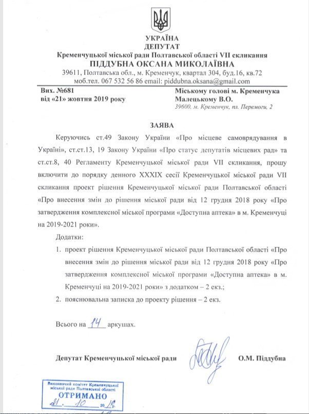 Пиддубная регистрирует в аппарате горсовета проект решения о внесении изменений в программу «Доступная аптека» и открытии коммунальной аптеки на Петровке.