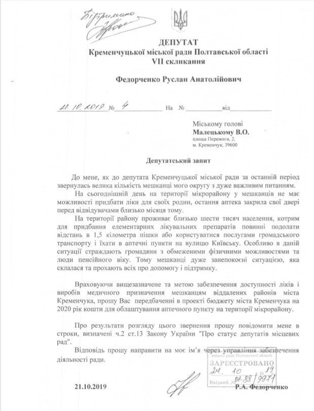 В аппарате горсовета регистрируют депутатское обращение Федорченко о необходимости открытия аптеки на Петровке.