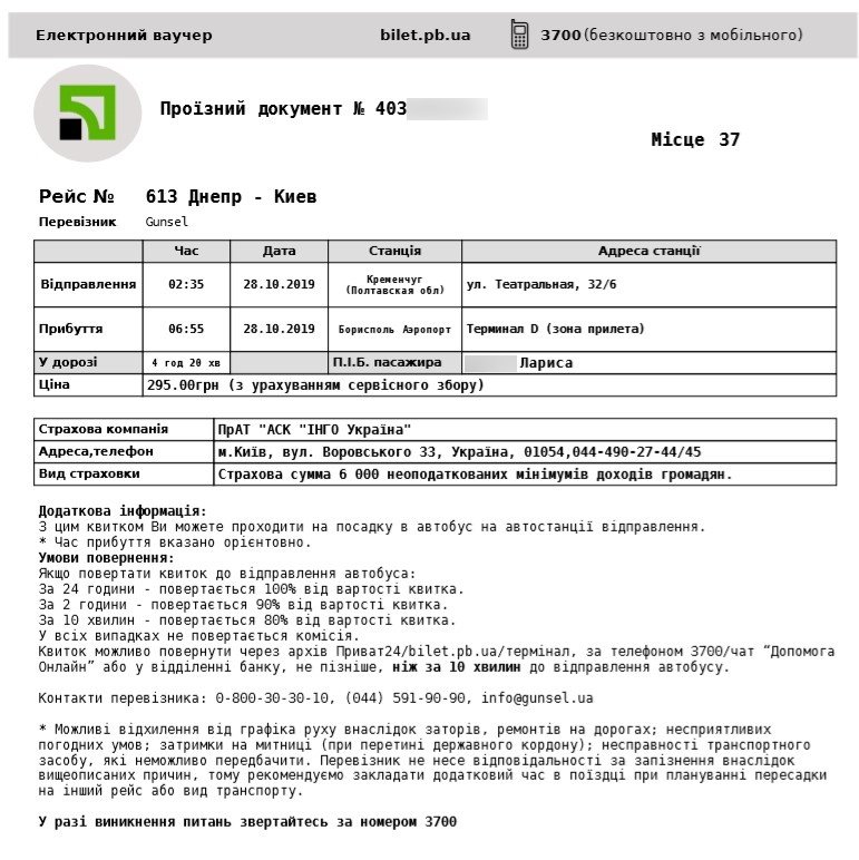 Отже, придбали квиток для поїздки з Кременчука до аеропорту «Бориспіль». Перевізник - «Гюнсел». Лариса сіла в автобус у Кременчуці 28 жовтня о 2.35. Близько 5.00, за словами Ані, їй зателефонувала мама та повідомила, що її та ще одного пасажира автобуса залишили на заправці в селі Пишне Лубенського району.