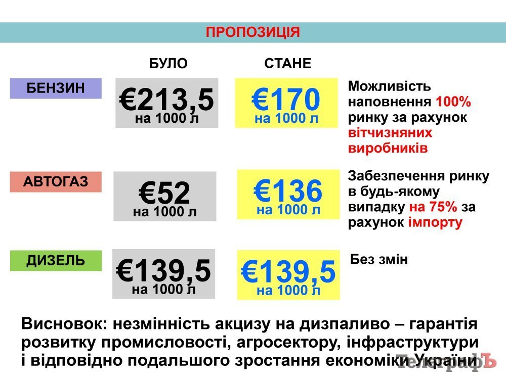– Ми пропонуємо зробити паритетні акцизи на бензин та скраплений газ з метою дотримання соціальної справедливості. Якщо теплота згоряння стисненого газу – це 0,8 одиниць від бензину, тому й ставка акцизу на скраплений газ має бути 0,8 від ставки на бензину. Бензин ми пропонуємо здешевити, а ціну на скраплений газ підняти. При цьому не чіпати дизельне паливо, тому що дизель – це сільське господарство, промисловість. Бензином ми можемо забезпечити Україну хоч і на 100%. Але Україна тяжіє до цифри два мільйона тонн споживання скрапленого газу. Такий обсяг не здатні виробити українські виробники,- розповів Руслан Ляпка «Телеграфу».