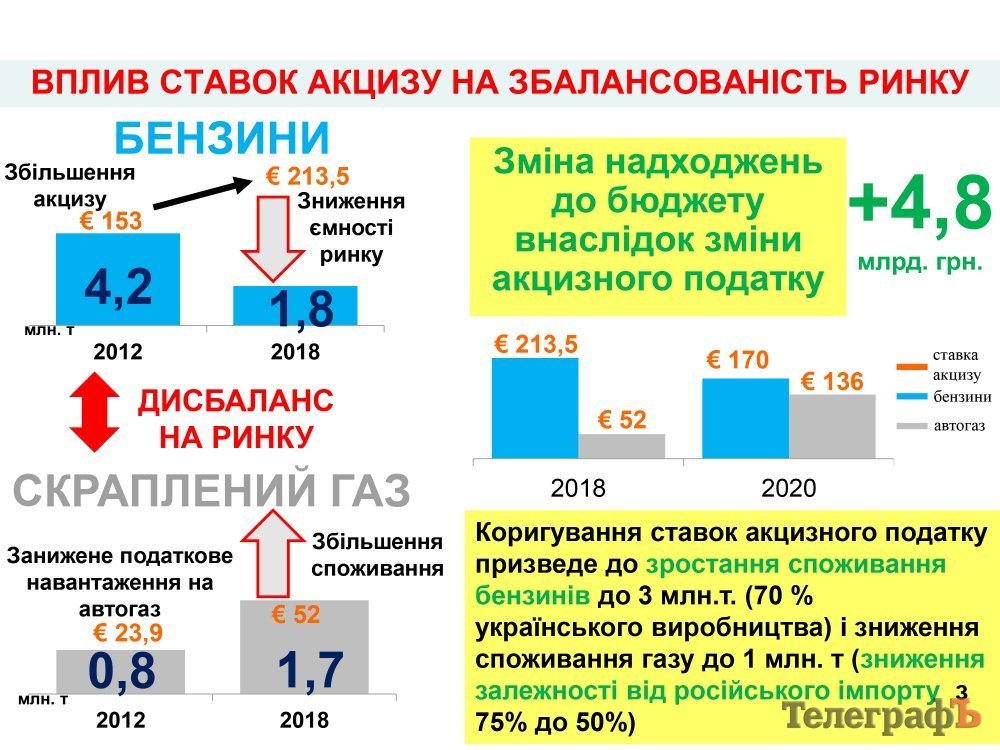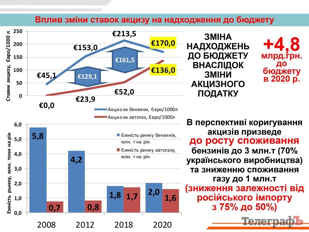 - Україна стала імпортозалежною від автогазу – в основному, російського або із російської нафти. Перекіс у бік споживання автогазу відбувся завдяки низьким акцизам на стиснений газ порівняно з бензином. (Так, у 2005 році споживання автогазу в Україні було 0,5 млн т, у 2018 році – 1,7 млн т, і це 75% імпорту). Натомість підвищення акцизу на автогаз принесе додаткові 4,8 млрд грн до бюджету.
