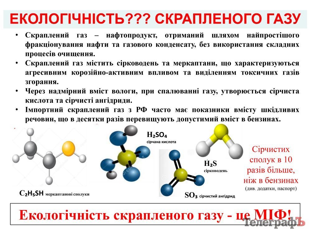 – По суті, газ, який виробляється газовидобувними компаніями – продукт перегонки. У них немає таких етапів очищення, які проходить бензин на нафтопереробному заводі, – зазначає Руслан Ляпка. – У нас є паспорти скрапленого російського газу: вміст сірки у 15 разів вищий ніж у бензині, зокрема, у кременчуцькому бензині Євро 5.
