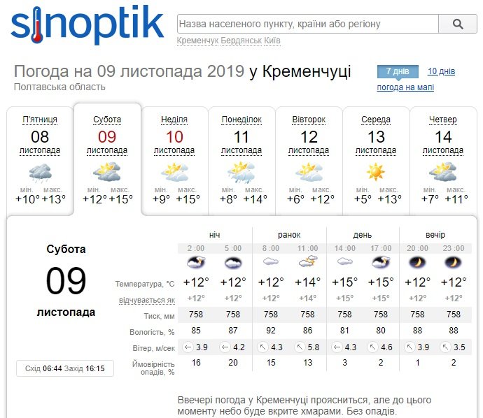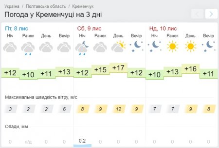 Схожий прогноз дає й Ventusky, проте цей погодний портал обіцяє невеликий дощ у суботу, 9 листопада, близько 14.00. Неділя, 10 листопада, незмінно залишається сонячним днем, хоча й з можливістю туманів. Стовпчики термометрів покажуть від +10°С до +17°С.