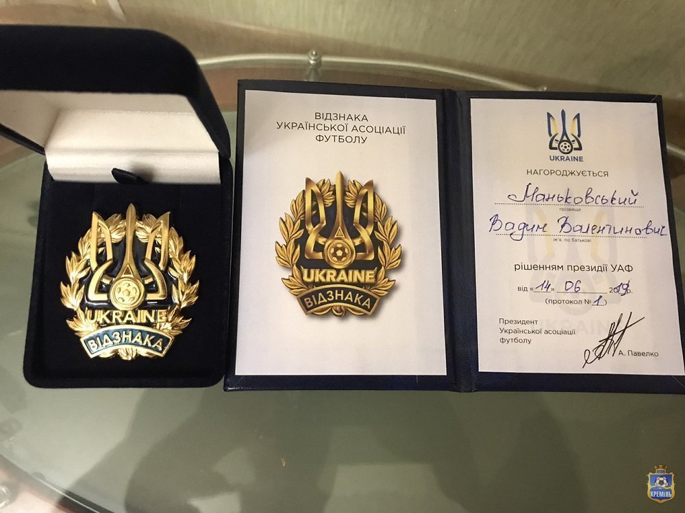 Заступник голови Федерації футболу Кременчука та МФК «Кремінь» Вадим Маньковський отримав відзнаку Української асоціації футболу (раніше Федерація футболу України – ред.) за розвиток футболу.