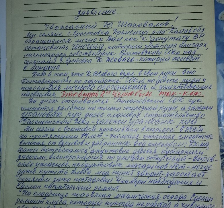 В письмах к президенту и нардепу оставшиеся в Еристовке жители рассказали, в каких условиях живут – из-за близости карьера у них появляются трещины на стенах домов, из колодцев ушла вода, фруктовые деревья не растут, засыхают. Также в селе разрушена инфраструктура, нет продовольственного магазина, зато есть проблемы с электроэнергией. Еристовцы просят помочь им с отселением в более комфортные и безопасные места, а также с получением материальной и моральной компенсации за годы, прожитые рядом с карьером (часть жителей Еристовки отселила компания FERREXPO, те, кто не согласился с условиями отселения, остались в Еристовке и теперь не могут оттуда выбраться).