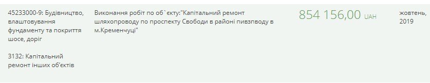 У планах ДЖКГ на жовтень — закупівля на суму 854 тис грн під назвою «Виконання робіт по об`єкту:«Капітальний ремонт шляхопроводу по проспекту Свободи в районі пивзаводу в м.Кременчуці» (теж допорогова сума на роботи). Проте звіт про закупівлю у ProZorro наразі не опублікований.