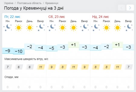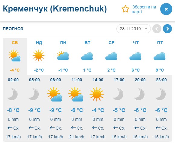 Найсуворіший прогноз на вікенд дає Ventusky — цей погодний портал пророкує холодні вихідні та тільки температуру зі знаком «мінус». Найморознішою стане субота, 23 листопада, чекаємо температурних показників від -9°С до -4°С, а у неділю від -7°С до -2°С. Проте вихідні у Кременчуці будуть сонячні, хмарні години можливі тільки у суботу, 23 листопада, зранку.