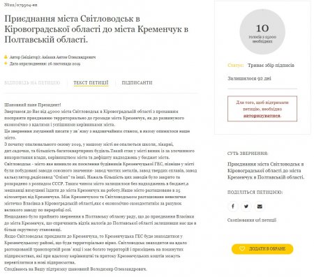 - Звертаюся до Вас від 45 000 міста Світловодськ в Кіровоградській області з проханням посприяти приєднанню территориально до громади міста Кременчук, як до розвинутого економічно з вдалими і успішними керівниками міста.