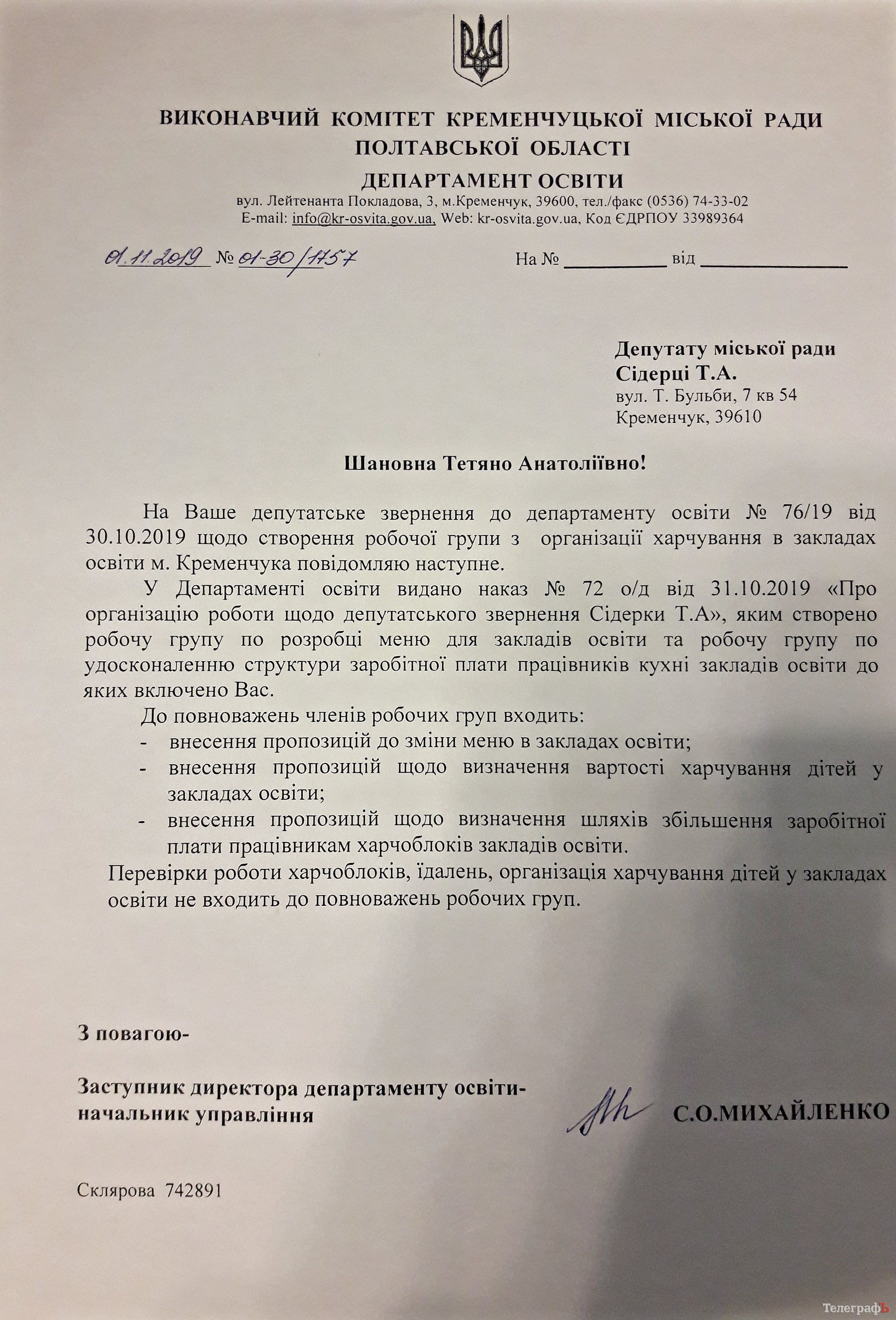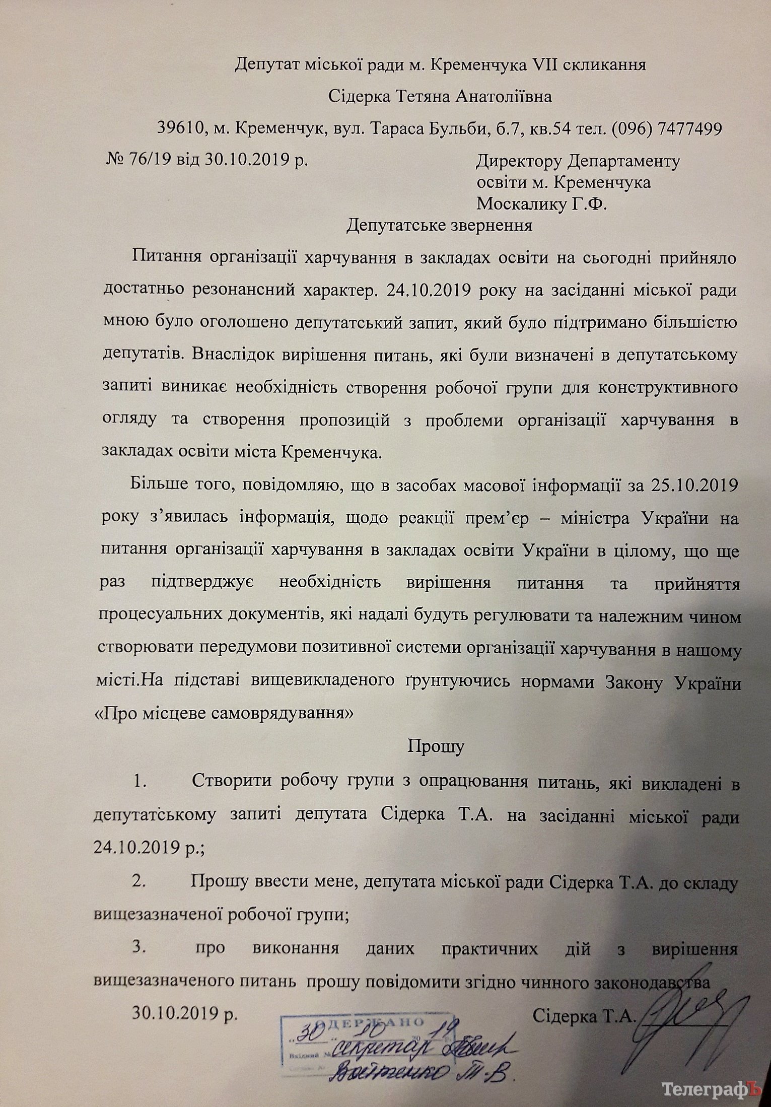 24 жовтня депутатка Сідерка на сесії міської ради надала депутатський запит, основними трьома питаннями якого були наступні: