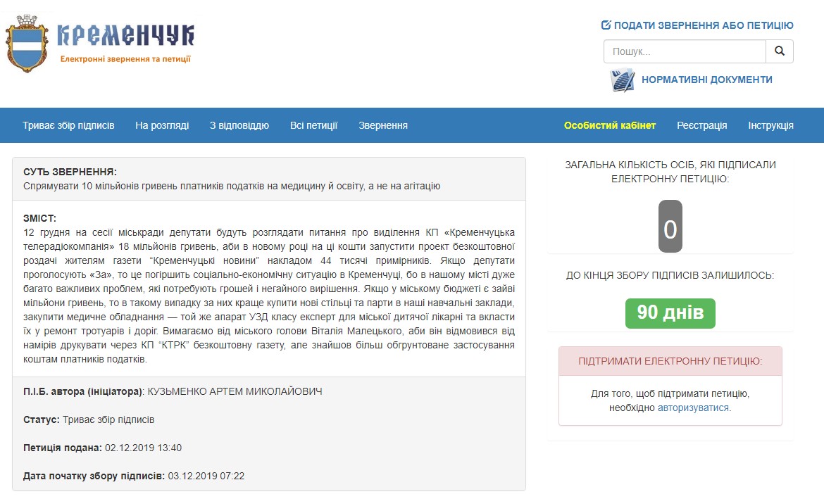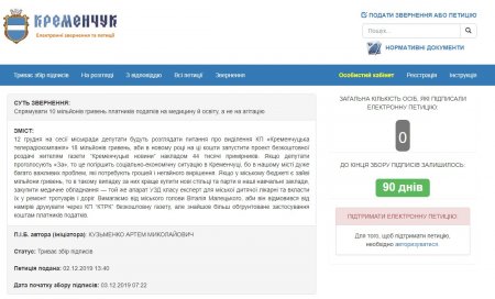 Третього грудня на сайті мерії з'явилась нова петиція до міського голови. Кременчужанин Артем Кузьменко просить мера Віталія Малецького спрямувати 10 мільйонів гривень платників податків на медицину й освіту, а не на агітацію.