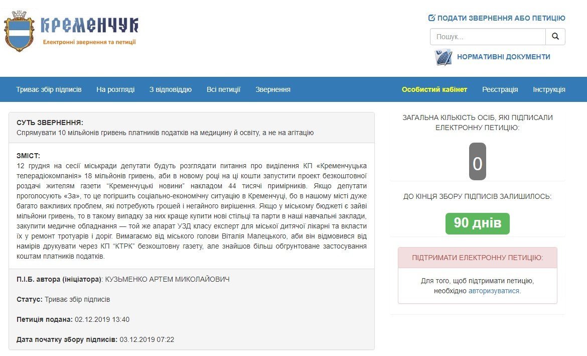 Третього грудня на сайті мерії з’явилась нова петиція до міського голови. Кременчужанин Артем Кузьменко просить мера Віталія Малецького спрямувати 10 мільйонів гривень платників податків на медицину й освіту, а не на агітацію.