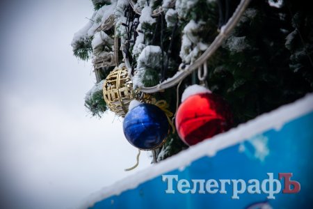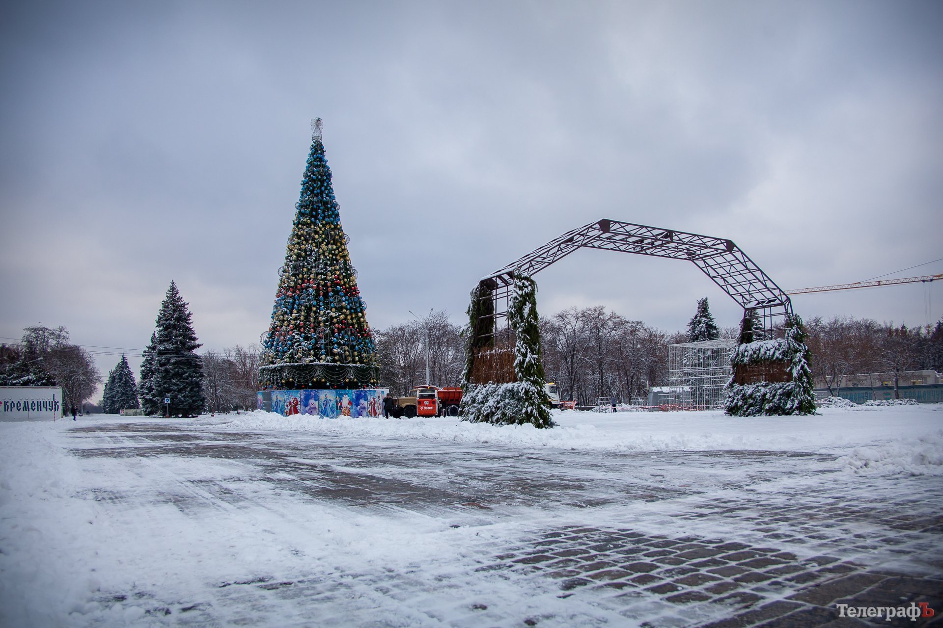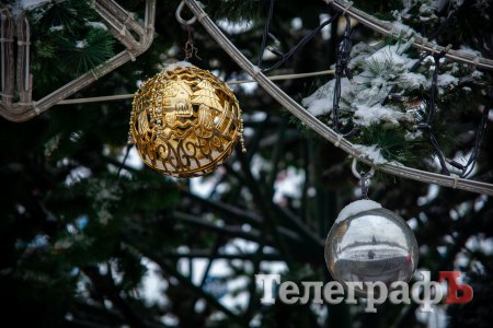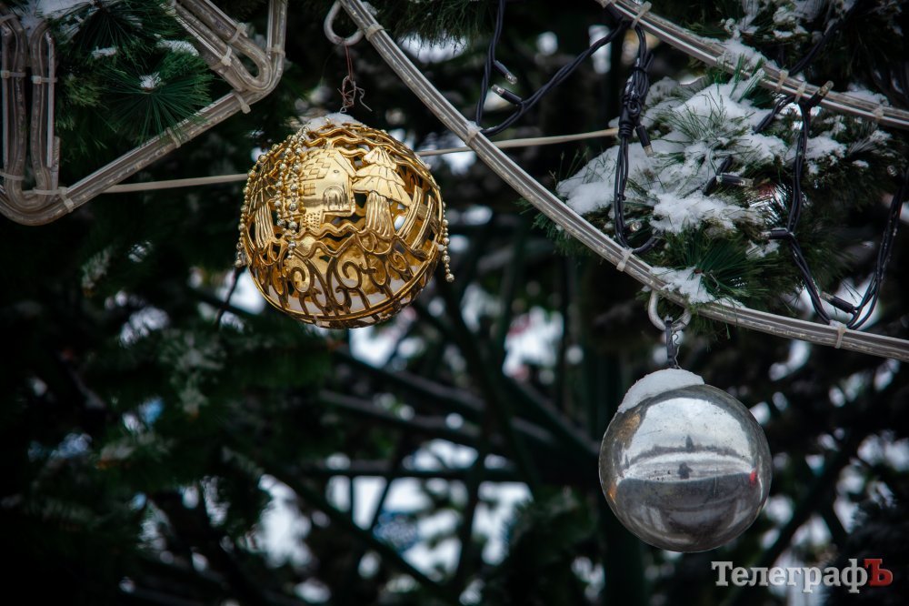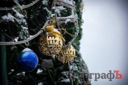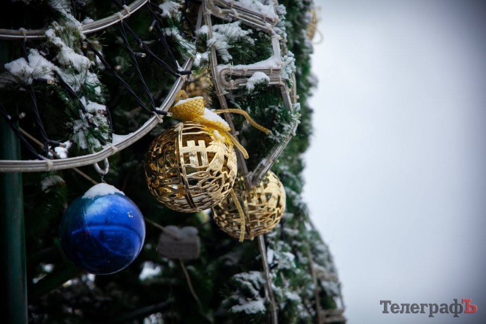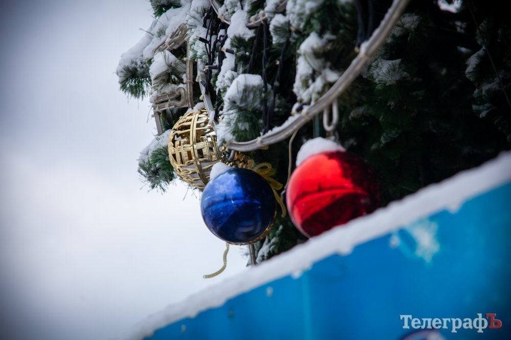 2 декабря в Кременчуге пошел перый снег. Белыми хлопьями припорошило весь город и главную городскую ёлку тоже. К этому времени коммунальщики уже успели украсить её новогодними игрушками, а также почти собрали арку-вход и светодиодный куб-подарок.