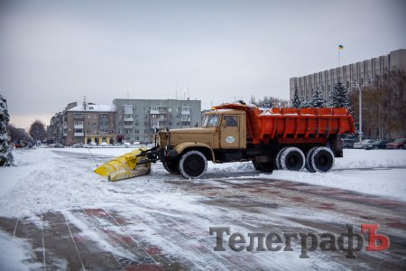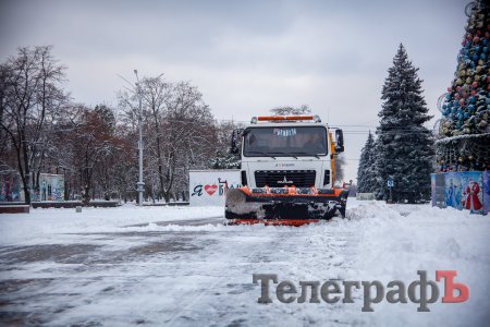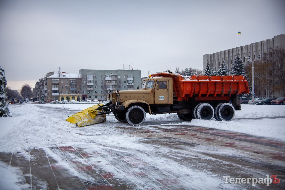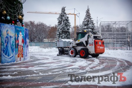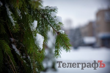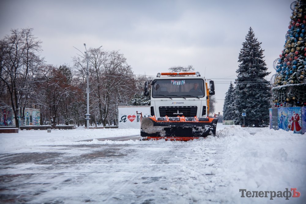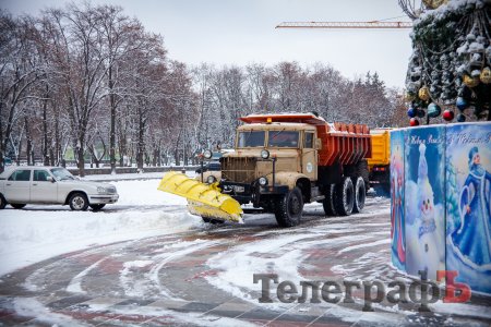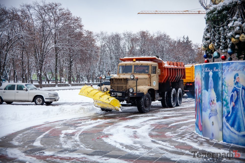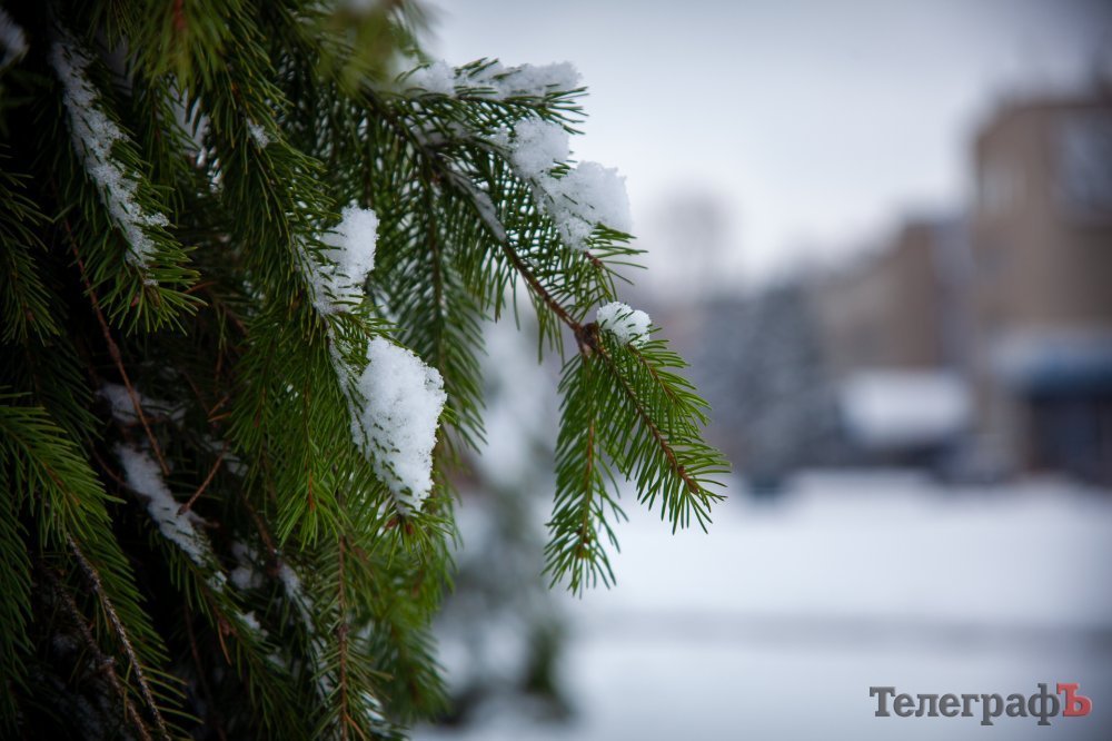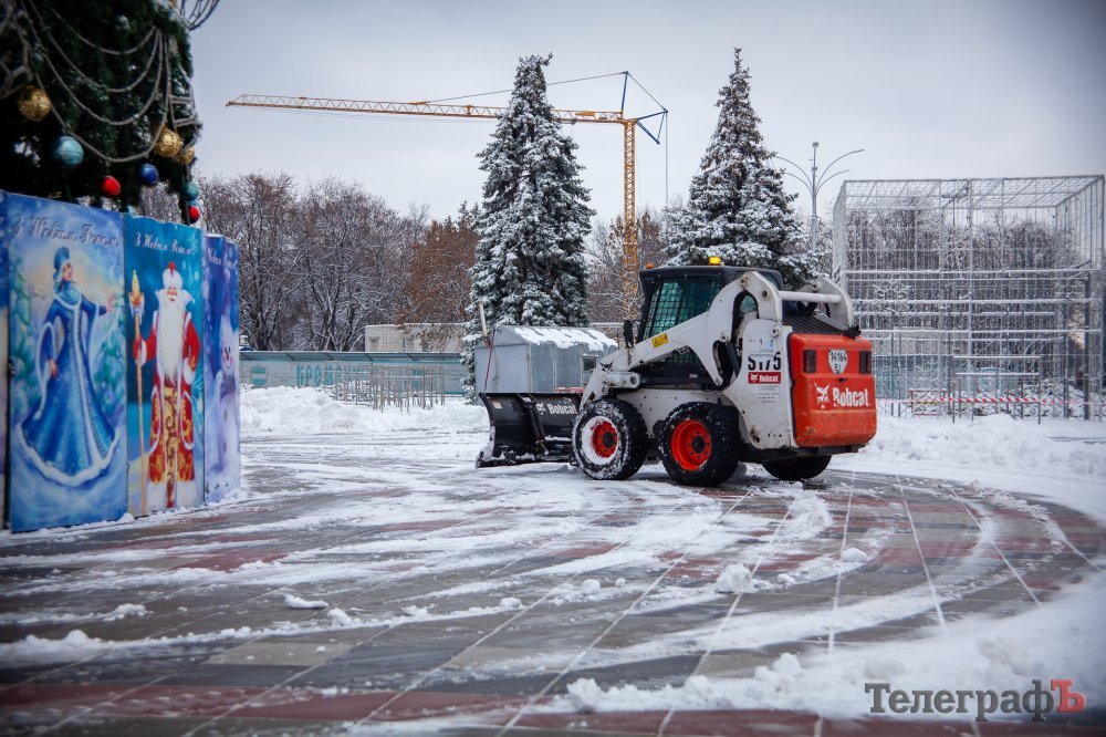 2 декабря в Кременчуге пошел перый снег. Белыми хлопьями припорошило весь город и главную городскую ёлку тоже. К этому времени коммунальщики уже успели украсить её новогодними игрушками, а также почти собрали арку-вход и светодиодный куб-подарок.