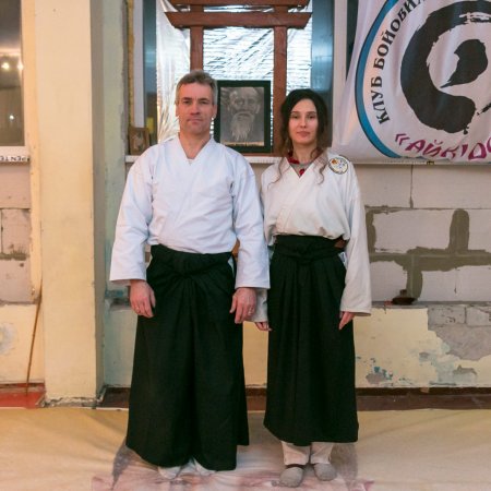 Керівник клубу Юлія Усенко (володар 1 дану айкідо) та президент федерації айкідо та будо Кременчука Андрій Малюк (володар 4 дану айкідо).
