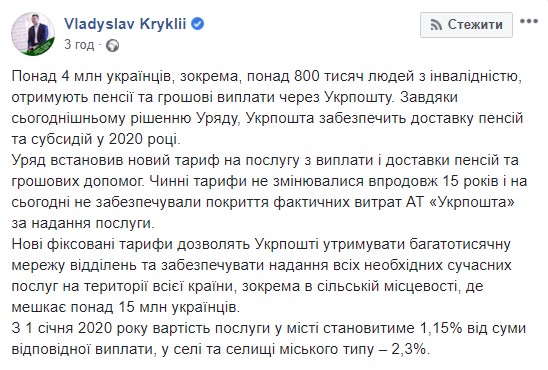 Кабмін ухвалив рішення про підвищення тарифів на доставку пенсій через відділення Укрпошти та поштарів. Про це повідомив у Facebook міністр інфраструктури Владислав Криклій.