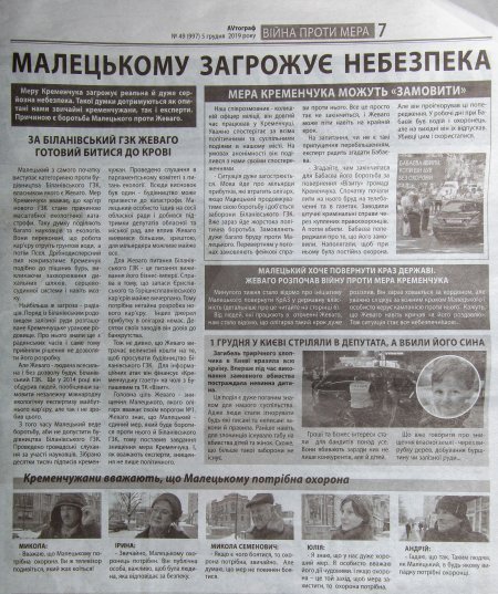 А это – страница частного издания «Автограф», которое в Кременчуге называют провластным. «Автограф» вышел в печать 5 декабря. И на седьмой странице мы видим опрос на тему: нужен ли мэру Кременчуга личный охранник? Узнаете лица? Это те же люди, которые днем раньше отвечали на вопросы коммунальной телекомпании.