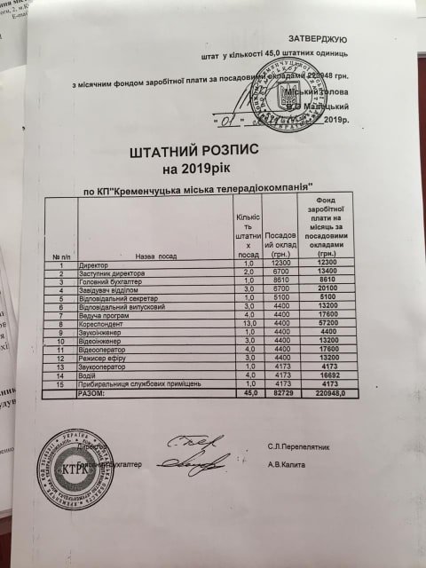 У штаті КП «Кременчуцька міська телерадіокомпанія», де регулярно з’являються дуже позитивні і часто хвалебні сюжети про команду «Малецького-Шаповалова» значиться 45 посад. Це, в середньому, як штат педпрацівників у одній міській школі. Хоча в деяких школах учителів навіть удвічі менше, ніж працівників комунального ТБ: за даними міського порталу відкритих даних, наприклад, у гімназіях №7 та №9 дітей навчають по 25 педагогів.