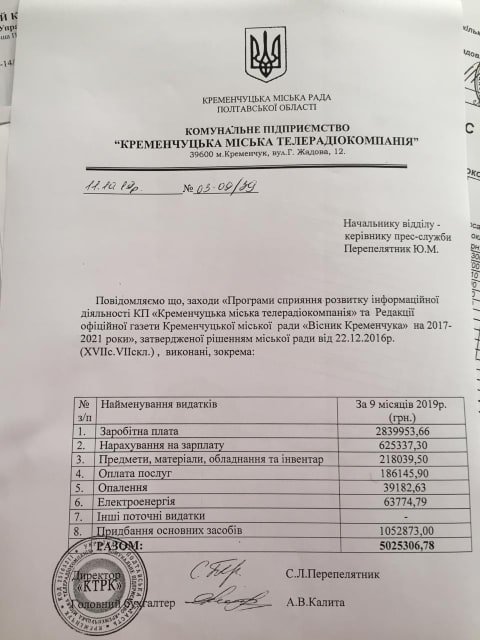 За 9 місяців поточного року на КТРК витрачено понад 5 мільйонів гривень, у цілому фінансування на поточний рік з бюджету передбачене в розмірі 8 мільйонів гривень.