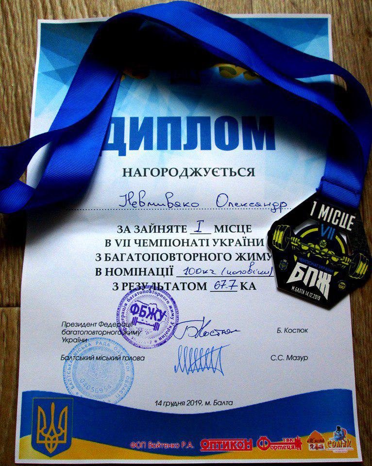 Кременчуцький силач Олександр Невмивако, неодноразовий рекордсмен, став чемпіоном України з багатоповторного жиму. VII чемпіонат України з багатоповторного жиму ФБЖУ відбувся 14 грудня у Балті Одеської області, у ньому взяли участь 64 спортсмени з різних міст України.