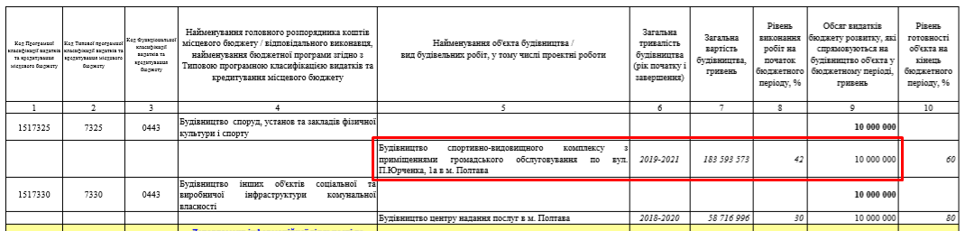 Так 10 млн грн передбачені на будівництво спортивно-видовищного комплексу з приміщеннями громадського обслуговування по вул. П.Юрченка, 1 у Полтаві.