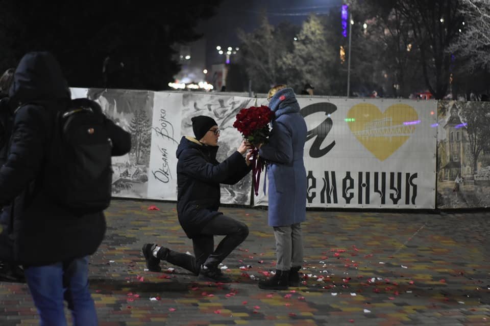 Біля головної ялинки Кременчука хлопець освідчився коханій. Романтичну подію кременчужани могли спостерігати на відкритті центральної ялинки Кременчука 19 грудня на алеї, яка веде до набережної Кременчука.