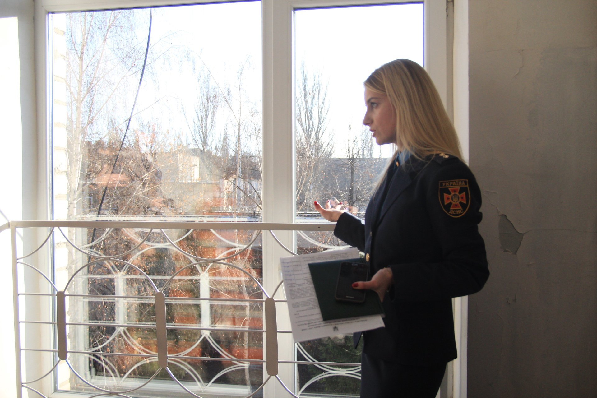 Окно на лестничной клетке закрыто защитной решеткой, чтобы во время эвакуации кто-то случайно не оступился и не выпал из окна