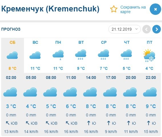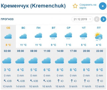 А вот Ventusky не согласен с коллегами — этот погодный портал не сулит кременчужанам осадков в выходные дни, но и солнечной погоды ждать не следует. Воздух прогреется до показателей от +3°С до +11°С, наиболее тёплым днём станет воскресенье, 22 декабря.