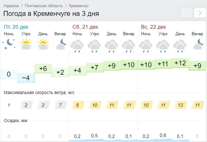Gismeteo прогнозирует, что дожди будут идти в Кременчуге на протяжении всего уикенда, прекратятся лишь вечером в воскресенье, 22 декабря. Столбики термометров покажут от +4°С до рекордных +12°С.