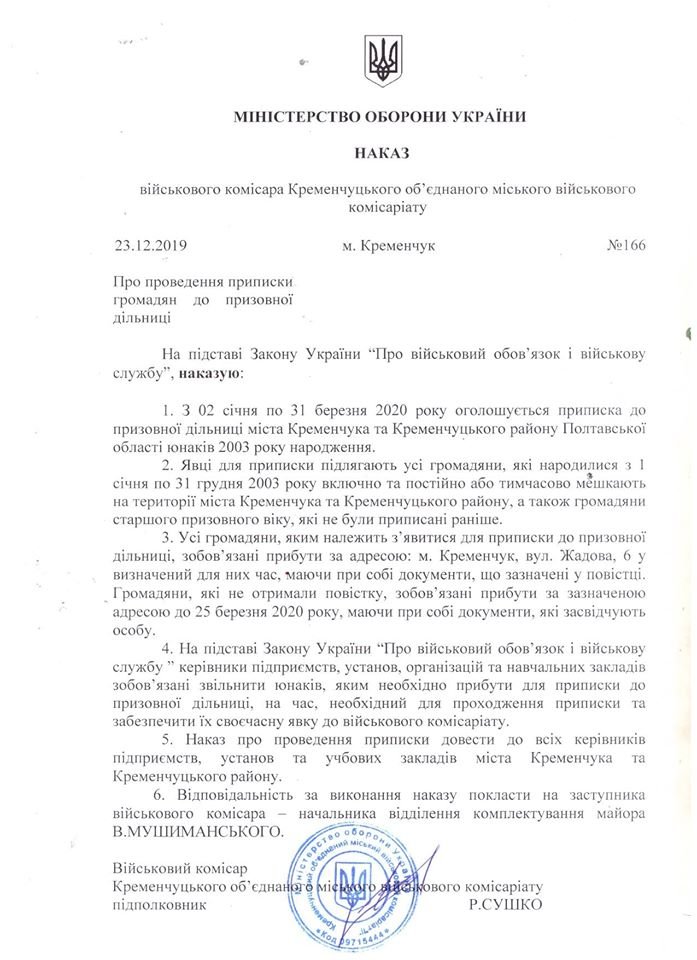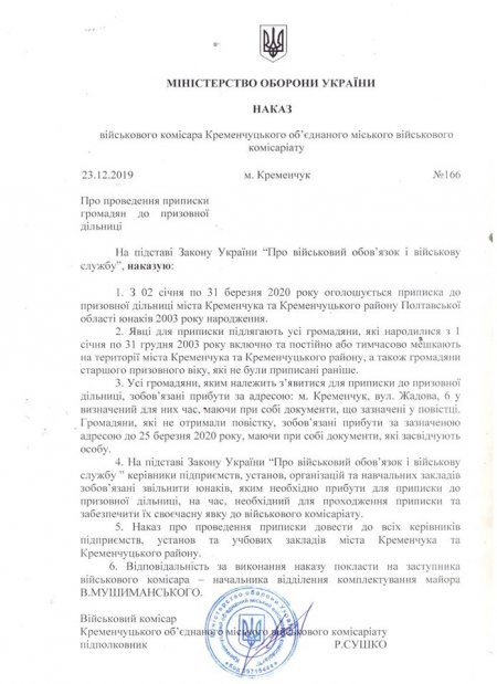 Згідно з яким, з 2 січня до 31 березня 2020 року зобов'язують з'явитися у військомат юнаків 2003 року народження, які постійно проживають на території міста і району, а також громадяни старшого віку, які не були приписані раніше.