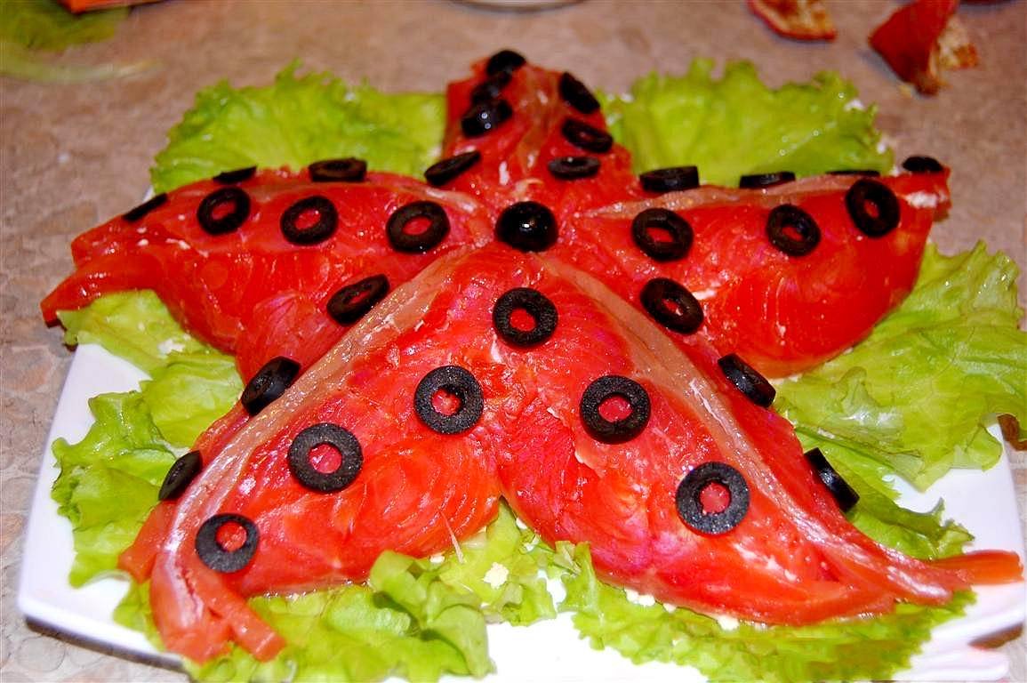 Перекласти масу на плоске блюдо, надати салату форму зірки. Тепер приступаємо до прикраси поверхні. Для цього тонко-тонко наріжемо помідор і червону рибку пластинками. Викладаємо на зірку спочатку скибочки помідора, потім пластинками рибу. Зверху посипати кунжутним насінням. Можна сервірувати салат шматочками лимона, маслинами і креветками. Готово!