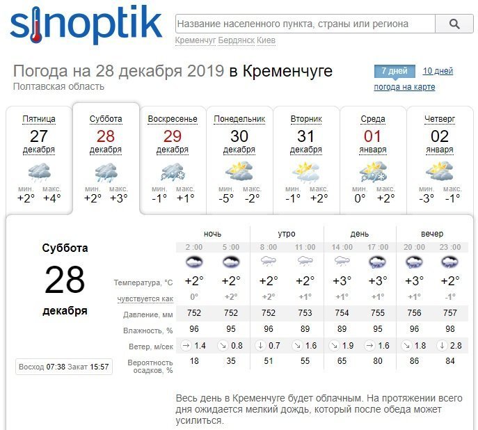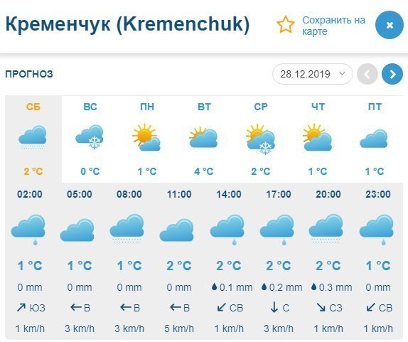 Ventusky рисует на уикенд такую же погодную картину, как и его коллеги: в субботу, 28 декабря, прогнозирует мелкий дождь. А вот воскресенье, 28 декабря, принесёт в Кременчуг снег, а под вечер в этот день температура опустится до значений со знаком «минус». В целом на выходных столбики термометров покажут от +2°С до -1°С.