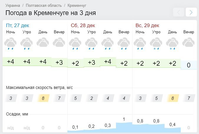 Gismeteo согласен с Sinoptik, этот погодный портал тоже обещает, что в субботу, 28 декабря, будет дождить, а в воскресенье, 29 декабря, стоит ожидать уже дождя со снегом. Температура будет колебаться от +4°С до 0°С.