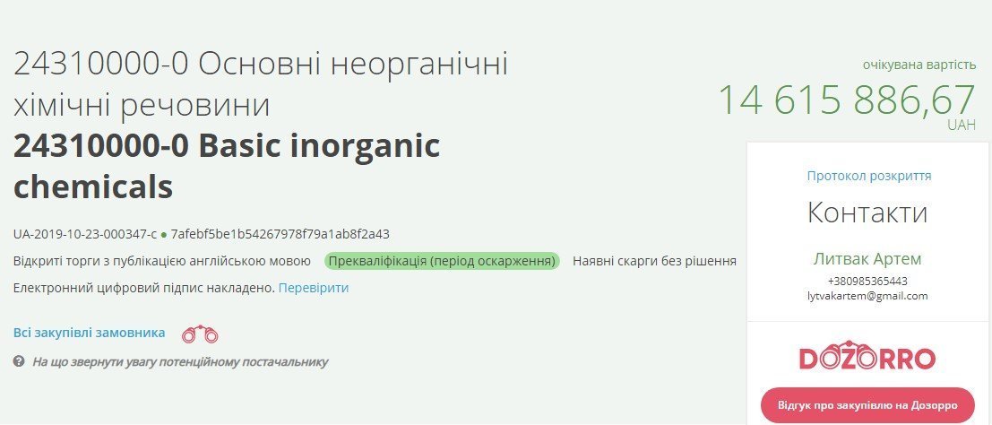 Інший допущений до аукціону учасник ТОВ «Євротех Інжиніринг» – теж з м. Дніпро. Його основний вид діяльності – будівництво житлових і нежитлових будівель. Тобто обидва учасники – посередники, скаржник – також. Виробники хімічних реагентів на тендер не прийшли.