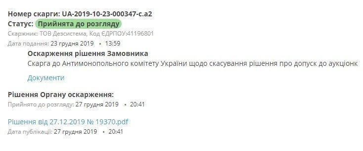 Аукціон на реагенти, які переможець тендеру поставить протягом 2020 року, має відбутися 3 січня. Та наразі дискваліфікований учасник – ТОВ «Дезсистема» 23 грудня подав скаргу до Антимонопольного комітету. Скаржник вимагає дискваліфікації й інших учасників, його конкурентів – ТОВ «Євротех-Інжиніринг» та НПП «Лаваль». У своїй скарзі до АМКУ ТОВ «Дезсистема» вказує, що їхні тендерні пропозиції також не відповідають умовам тендерної документації, визначеним замовником. 27 грудня АМКУ прийняв до розгляду заяву ТОВ «Дезсистема». Якщо наразі дискваліфікують бодай одного учасника із двох допущених до торгів, то коштовну закупівлю визнають такою, що не відбулася.