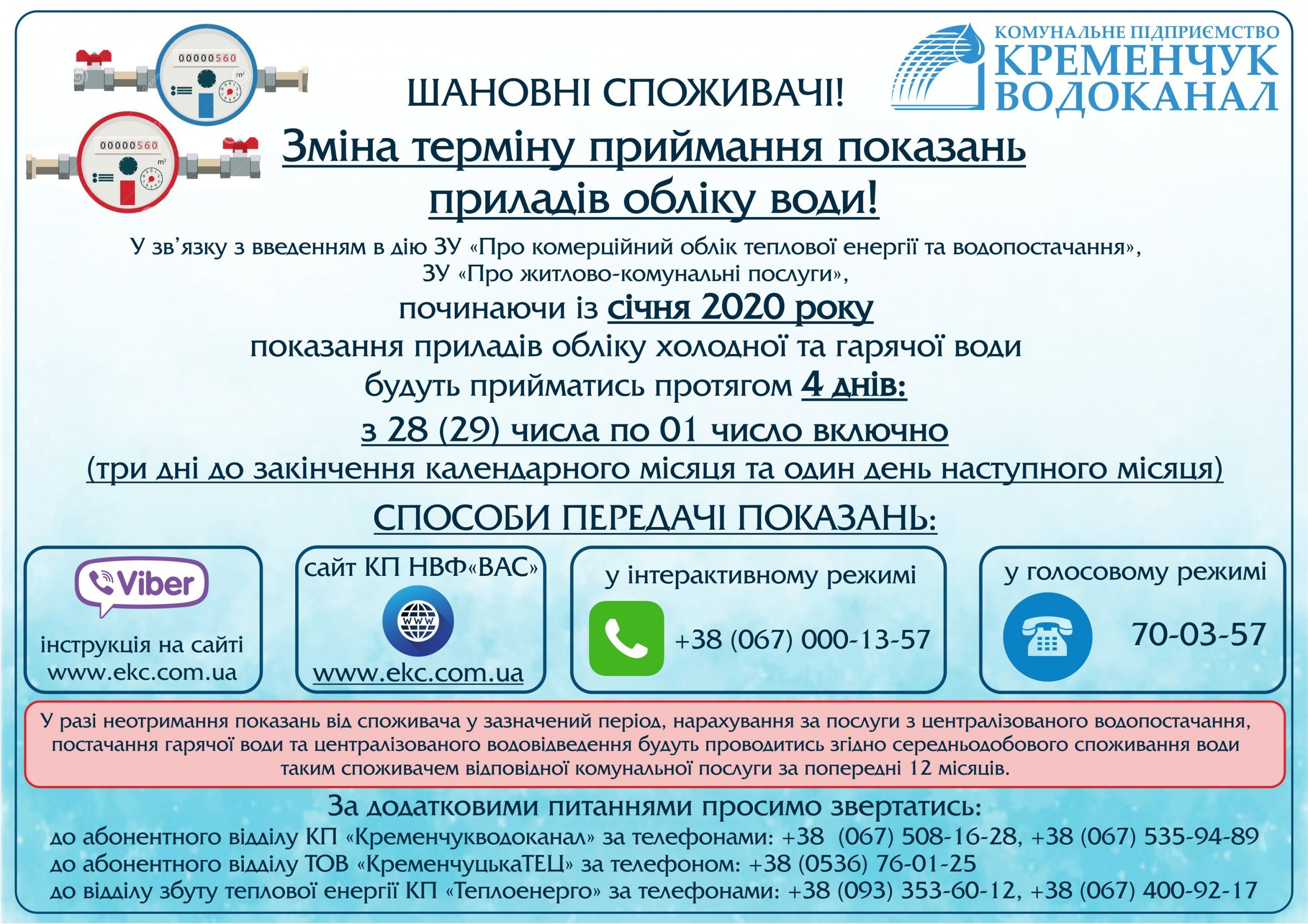 Починаючи з січня цього року показники приладів обліку холодної та гарячої води будуть прийматися протягом трьох днів до закінчення календарного місяця та протягом першого дня наступного місяця, тобто з 28(29) числа по 1 число включно. Ці показники будуть вважатися прийнятими станом на останній день календарного місяця.